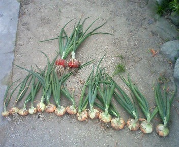 他の玉ねぎは茎が折れて、枯れてきた頃に収穫すると、みずみずしくて美味しいそうです